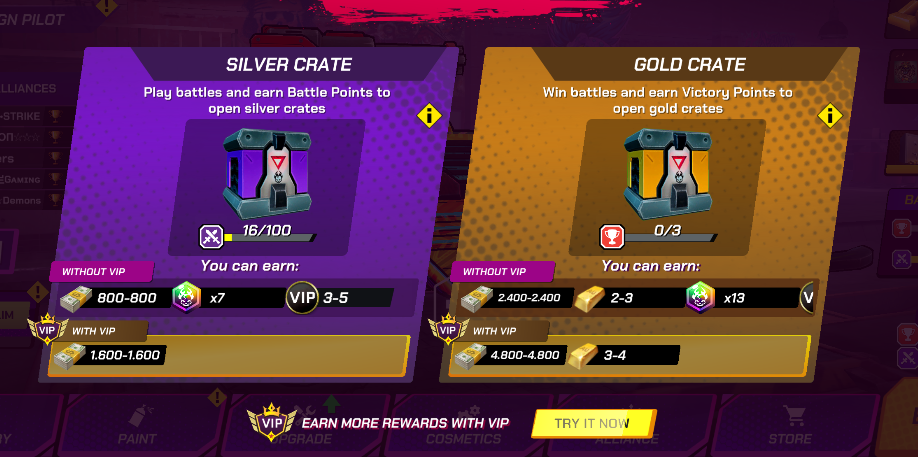 Additionally, having an active VIP Subscription increases the rewards obtained from opening crates. The higher your VIP level, the greater the rewards.