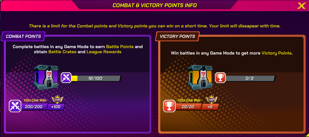 You can increase your maximum limit of Combat and Victory Points by Ranking Up on the Leagues Division and acceding to a VIP Subscription. Also Ranking Up on the Leagues Division allows you to consume more Combat and Victory Points, making it easy to spend more points on each battle to also get more Rewards on each battle.